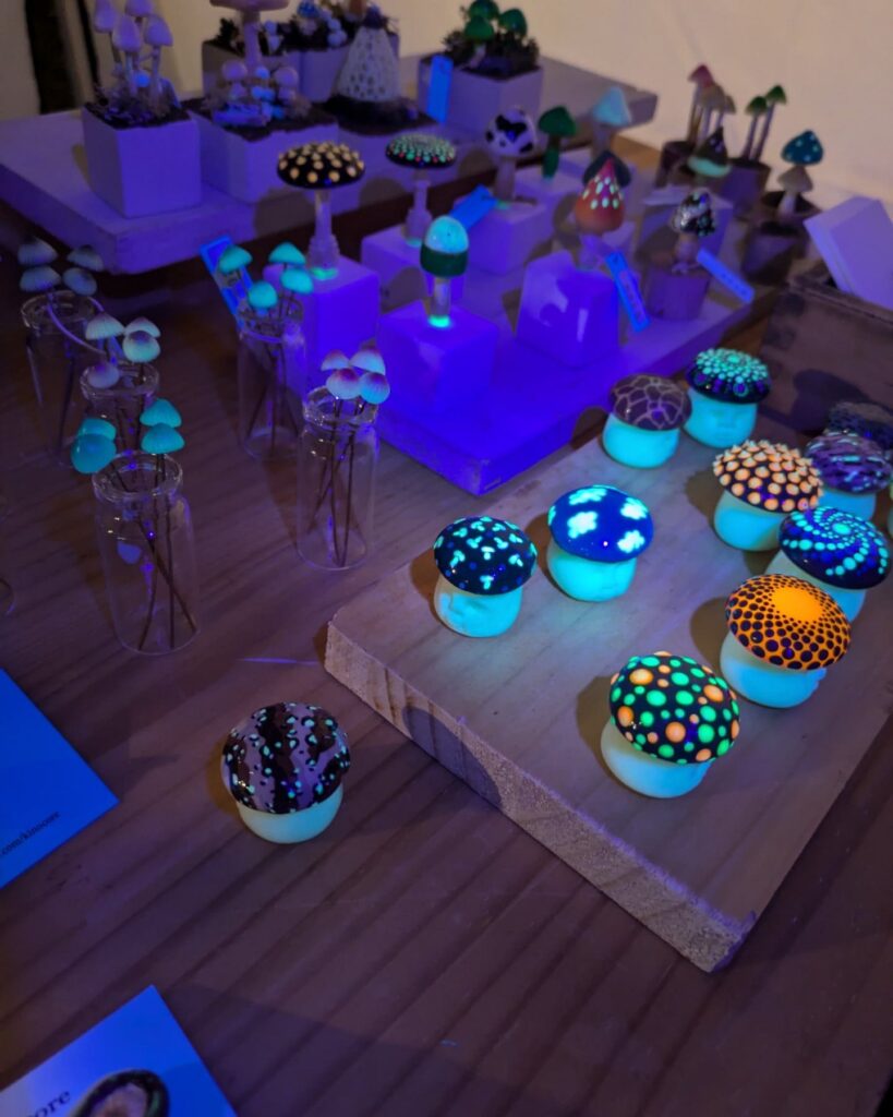 作品のほとんどが蓄光タイプで、光をためて暗闇でほんのり発光します。