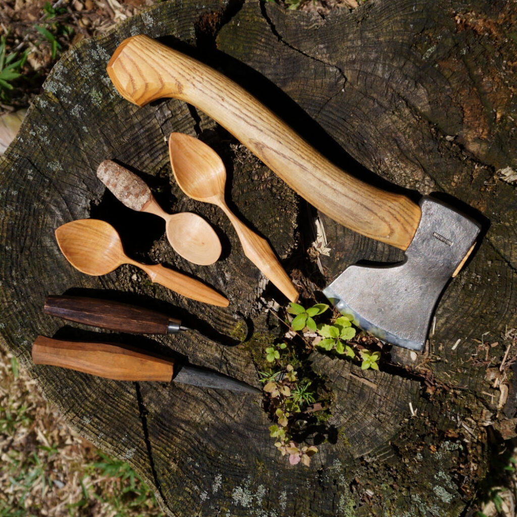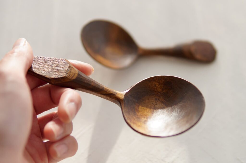 新鮮な生木を斧やナイフなどの手道具だけを使うグリーンウッドワークの技法で北欧形のスプーンを中心に制作しています。生木で削り、乾燥する過程で「狂い」と言われている欠点を作品のフォルムに活かしています。丸太を割り、生木の声を聴きながらプリミティブな手法で制作することを大切にしており、作品はすべて一点ものとなりますが、使い手の手のかたちもそれぞれ。多種多様なかたちのなかから手に馴染むスプーンを選び、ともに時間を重ね、雰囲気を纏うスプーンへと少しづつ育てながら長く使ってゆく体験は使い手の自己肯定になりうるのでは、そして心身健やかに日々を重ねてゆくための日用品のひとつにしてもらいたいと思いながら、日々手を動かしています。