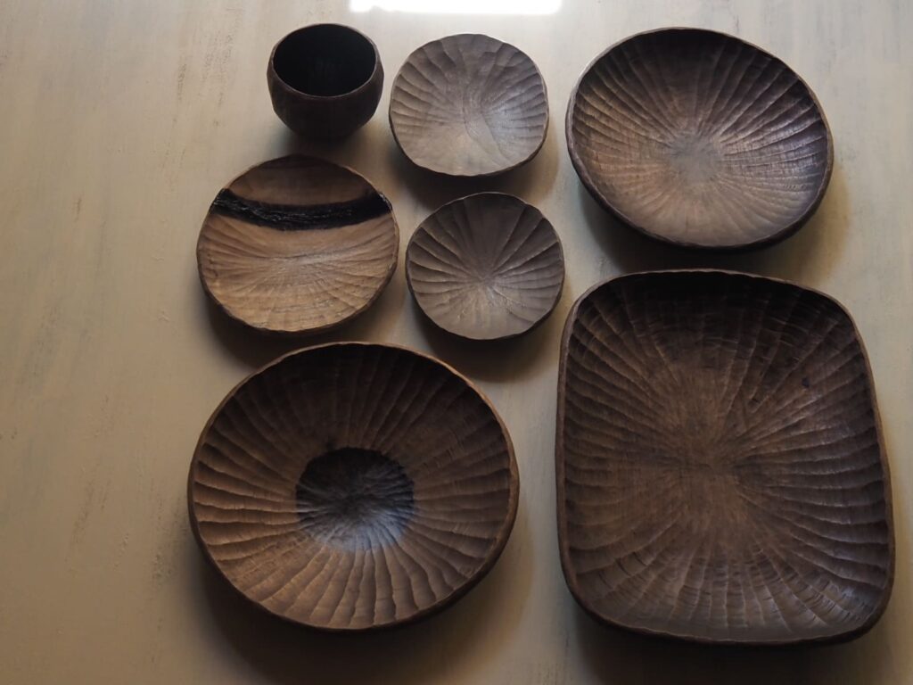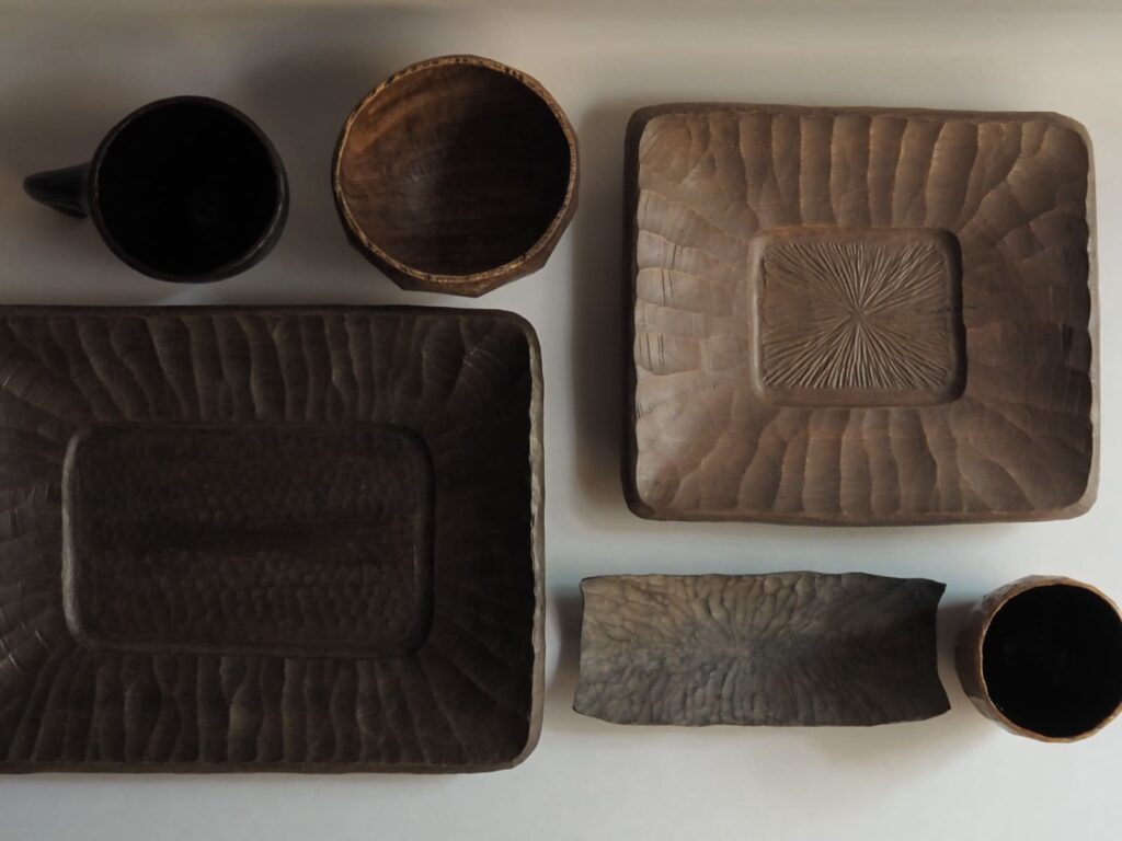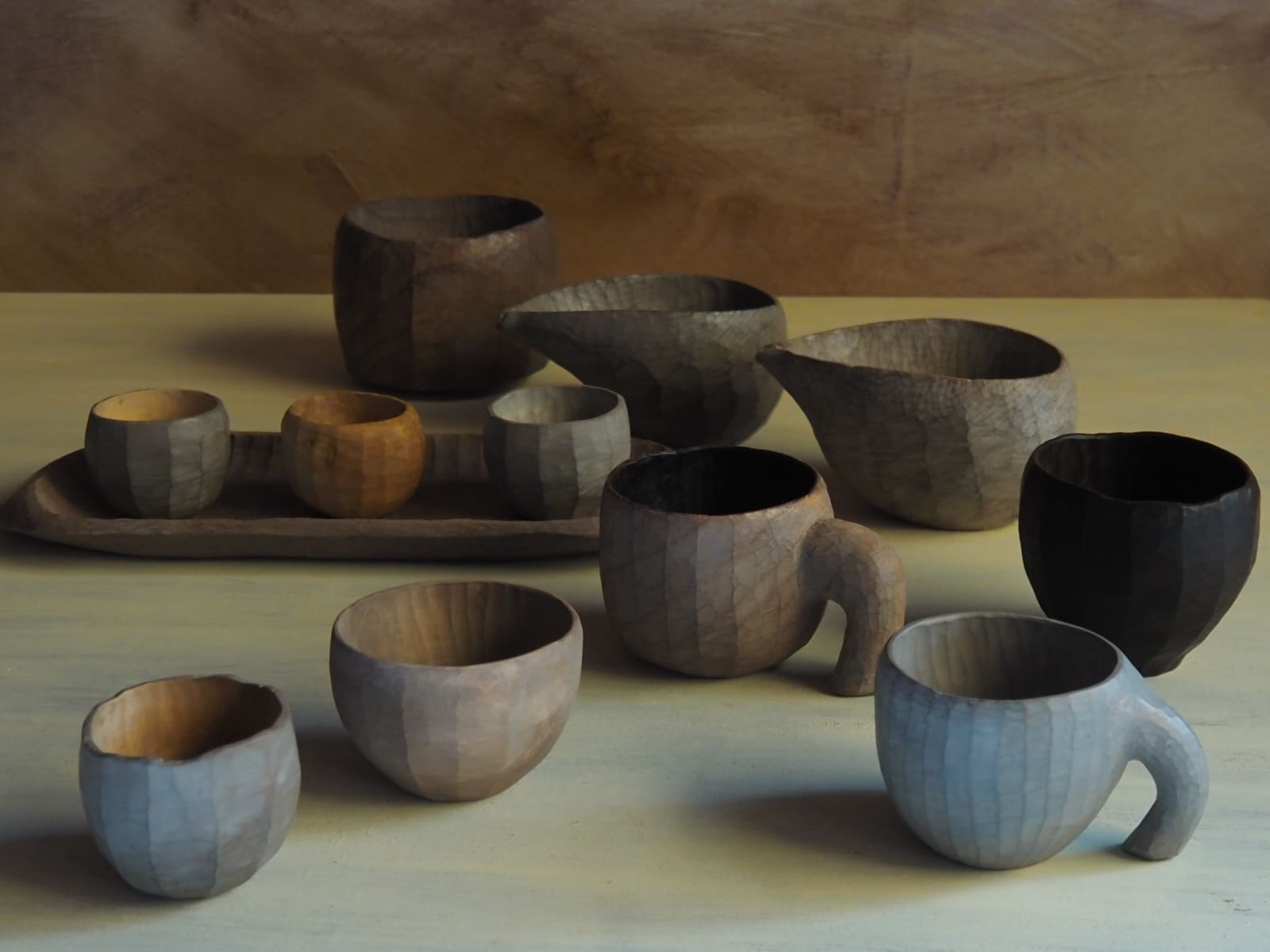 木でカップや茶碗、お皿といった器やカトラリーを作っています。柿渋、弁柄、草木染、漆などで色を出し、磨き、表情は時に素材不詳な感覚も。だけども、手に取れば軽く(時にずっしり)、眺めれば年輪や文様のように浮かぶ水や栄養分を運ぶ道管も見え、確かに命ある木だった事が感じられます。木をくらしの中で活かし、愛でることのできる道具となって欲しいと思っています。