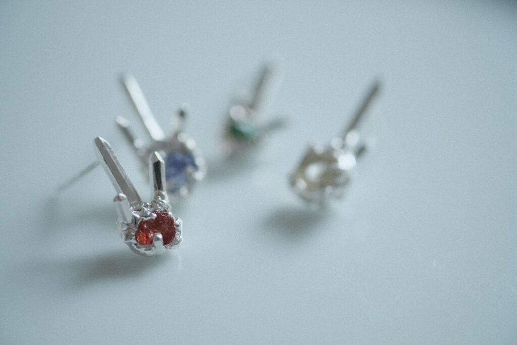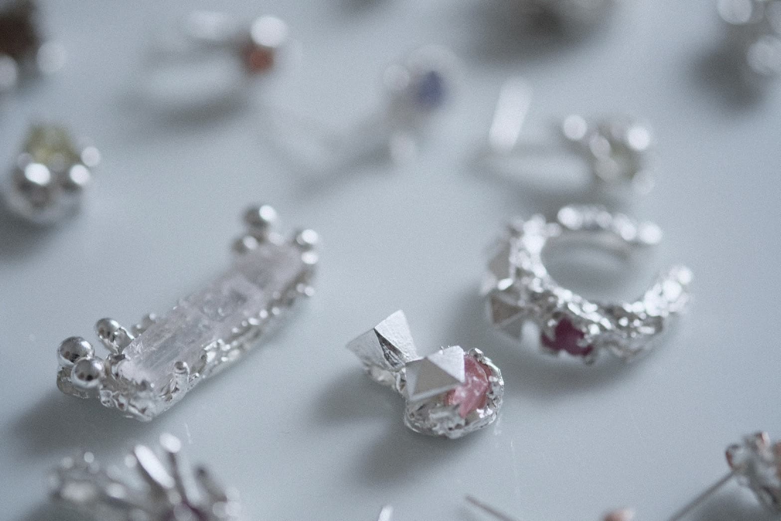 主に銀を使用した一点ものですが、金など異素材を組み合わせ新たな表現に挑戦しています。また、形の定まらない石を留めるのは難易度が高いのですが経験を活かした技術で一期一会の出会いを楽しんで仕上げています。
