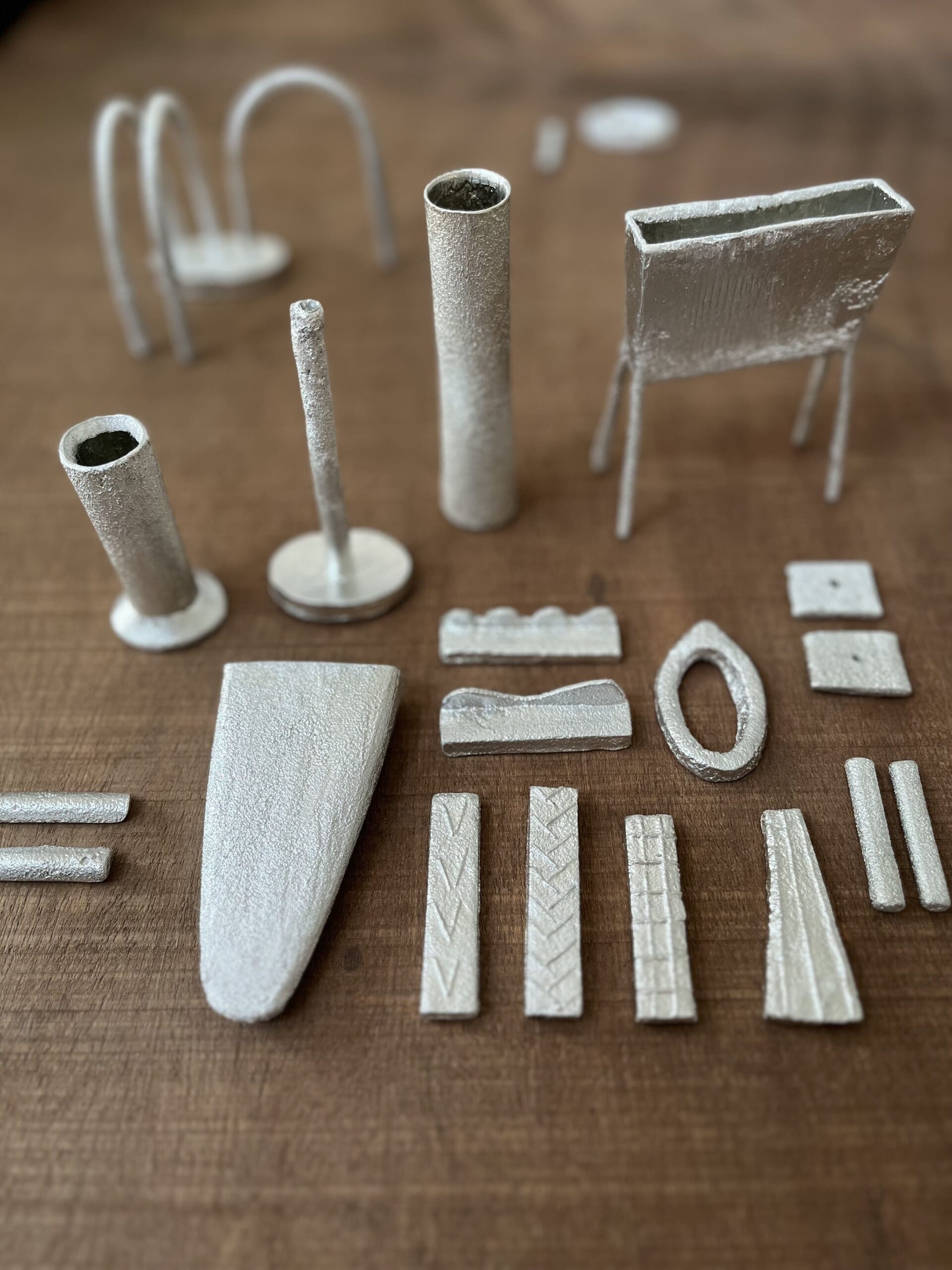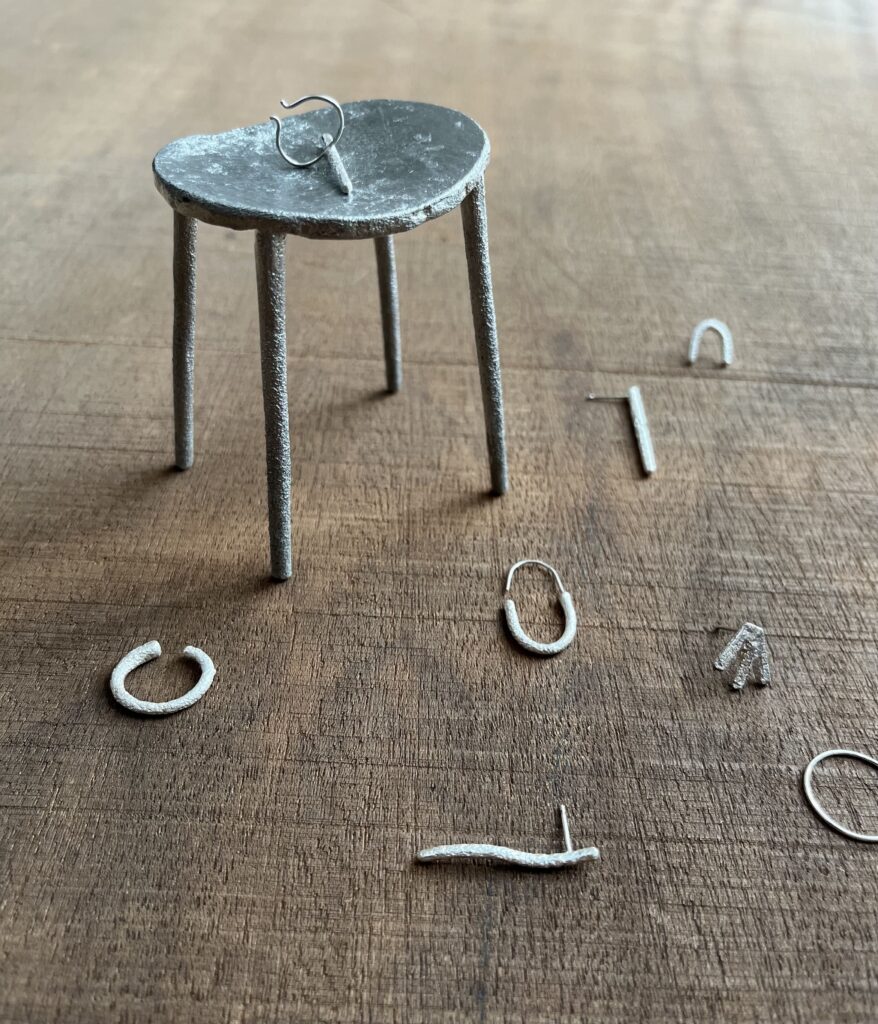 銀の装身具、錫の花器等を製作しています。金属を溶かして砂型に流す、〝鋳造〟という技法でつくっています。