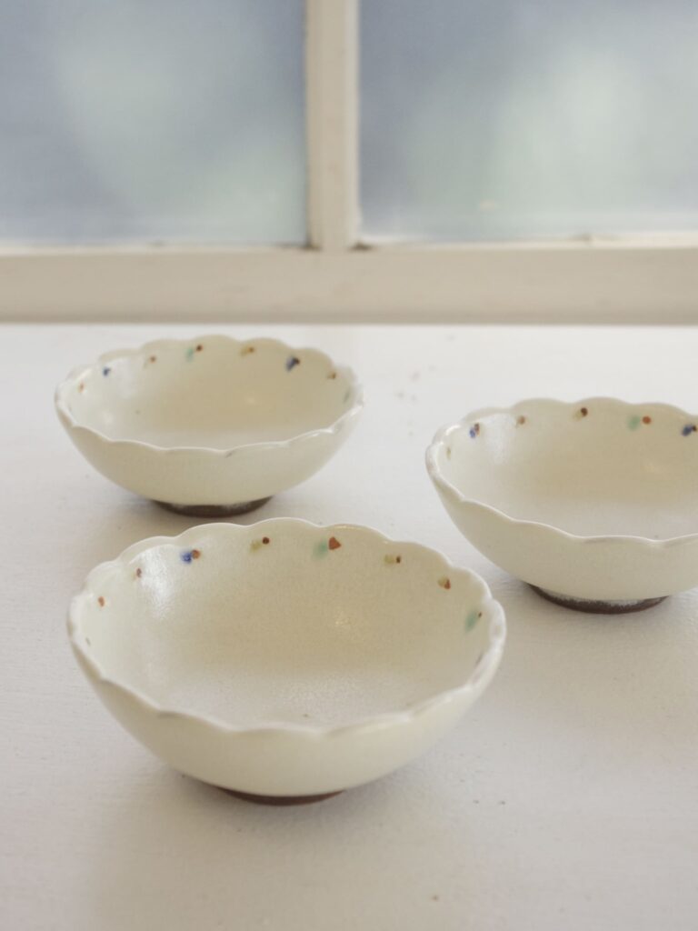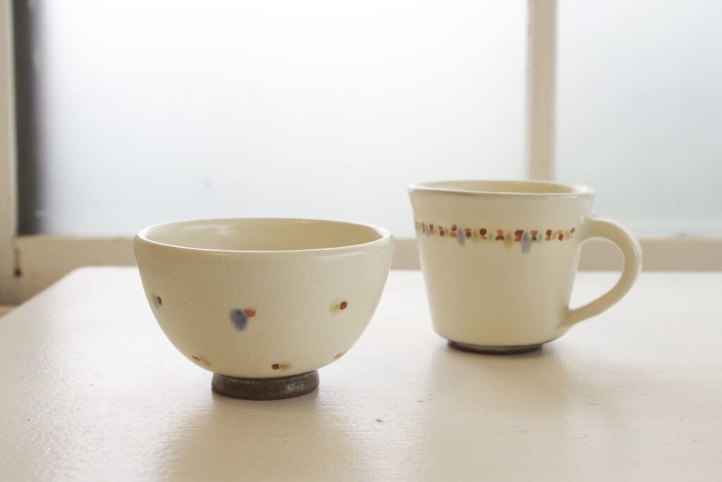 釉薬と泥漿を点で並べて器に装飾しています。隣り合う色が混ざり合ったり合わなかったり、いろんな表情が見えるところが面白くて好きです。日常使いのものを中心に製作しています。