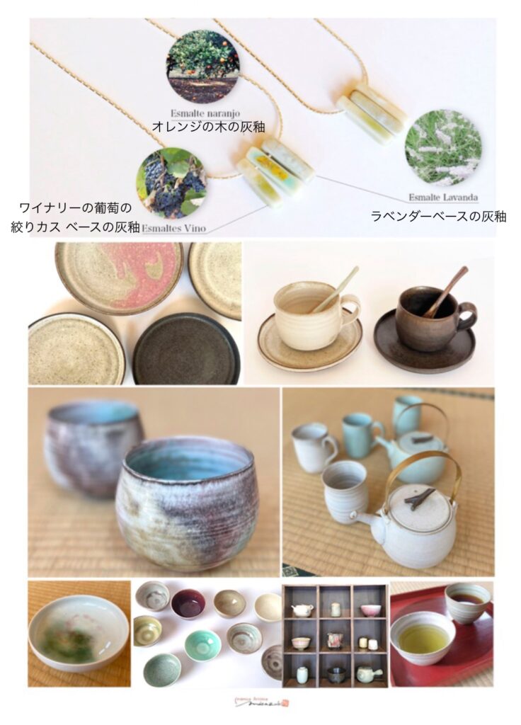 暖かみのある釉の色は主に植物灰(オレンジの木、オーク、ラベンダー、ザクロ、桜、コーヒー豆やワイナリーのブドウの絞りカスのリサイクル素材)、南にあるサハラ砂漠から届く微粒な砂…そして天然鉱物の配合によるものです。型は使わず全て一点物です。