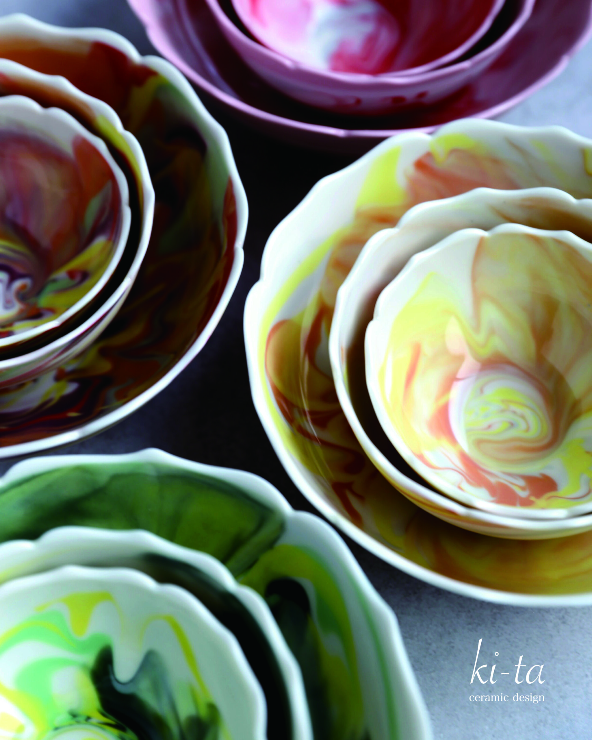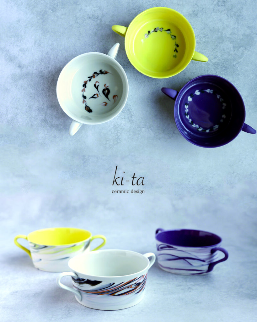 「工芸とプロダクトの間」をコンセプトに製作しています。石膏型を用いた製法を使用しており、形状は同じですが色、柄、重さなど一つ一つに個性のある作品を目指しています。排泥鋳込みと練り込みという製法を応用することで、工芸の持つ唯一性とプロダクトの持つ統一間を合わせ持った作品になっています。